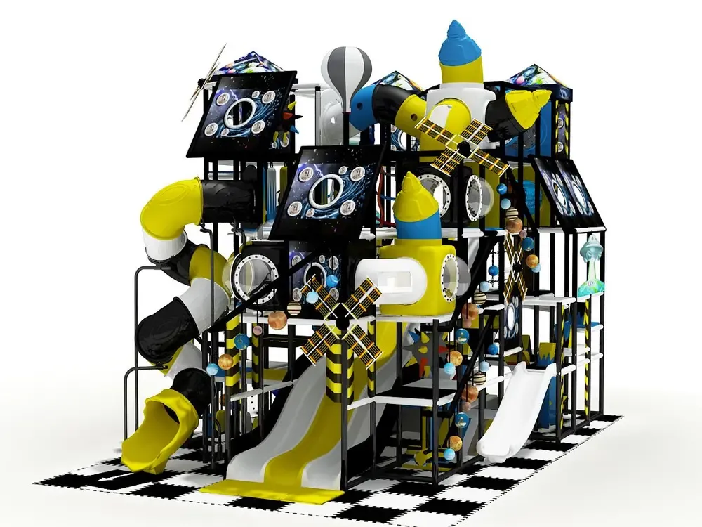 Najväčšou prednosťou tejto zostavy je jej úplne odlišný architektonický štýl, ktorý nepôsobí bežne ani katalógovo. Kombinácia rakiet, satelitných prvkov, vesmírnych panelov a kontrastnej farebnosti vytvára interiérové detské ihrisko, ktoré okamžite priťahuje pozornosť a v priestore funguje ako výrazná dominanta. Práve takýto prístup je veľmi cenný pre zábavné centrá, ktoré sa chcú vizuálne odlíšiť a ponúknuť rodinám niečo zapamätateľné.