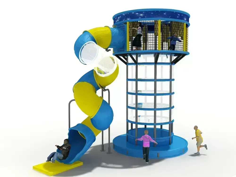Vertikálna viacpodlažná konštrukcia umožňuje plynulý pohyb detí medzi jednotlivými úrovňami, pričom tubusový tobogan poskytuje bezpečný a atraktívny zjazd. Transparentné prvky zároveň zlepšujú prehľadnosť a kontrolu nad priestorom.